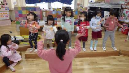 また、指揮をする子どもが出てきたり、自分でカスタネットの楽器をする子どもも出てきて、それぞれに楽しいことを見つけて遊んでいました。