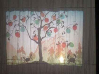 先生からのプレゼントは「さるかに合戦」のお話です。OHPのカラーシートのシルエットが暗い部屋に浮かびあがります。
