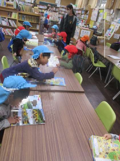 「恐竜の本があった!」「幼稚園のと同じのがあったよ」と友達に知らせたり、一緒に見たりしていました。