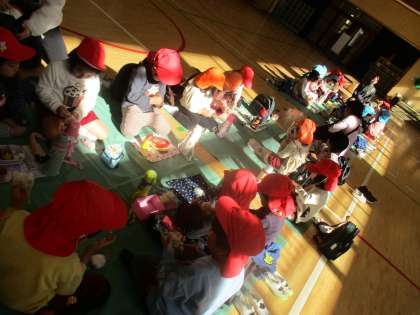 お昼は体育館をお借りしておにぎりを食べました。風が強く寒い日でしたが、体育館の陽だまりは暖かく、ゆったりと過ごすことができました。