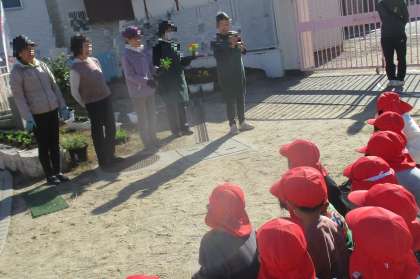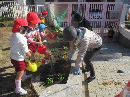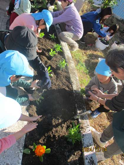 子どもたちは、苗をポットから上手に出す方法や根っこの大切さを教えてもらい「ピースのて、こう?」「もっとしたい!」と言いながら何個も植えていました。