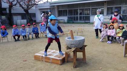 の掛け声と一緒に、子どもたちが元気いっぱいもちつきしました。