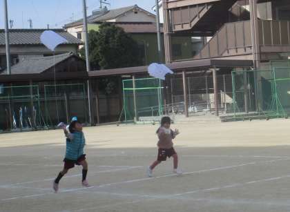 園庭では木の枝に引っかかったこともありましたが、校庭は広いので、凧糸をいつもより伸ばして挑戦です。