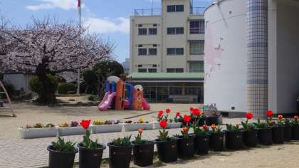 幼稚園の桜が咲き始め、子どもたちと一緒に植えたチューリップもかわいく咲いています。