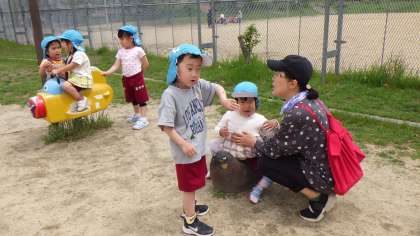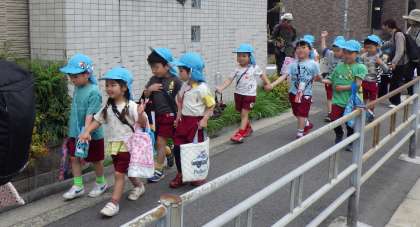 5歳児、ゆり組だけで住吉図書館と沢之町公園に出かけました。ばら組さんが園庭に並んで「いってらしゃい」と見送ってくれました。