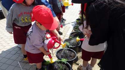 次はふれあい栽培! 公開日 2025/04/30 更新日 2025/04/30 お知らせ 保育参加の後は、ふれあい栽培です。 子どもたちは、お家の方と一緒に夏野菜の苗を植えました。 植木鉢に土を入れ、苗を植え、水をたっぷりあげました。 大きな植木鉢なので、子どもたちにとっては少し大変そうでしたが、お家の方と一緒ならとっても楽しそう♪ おいしいお野菜ができますように・・・ 明日からの水やり、頑張ってくださいね! いいね(0)