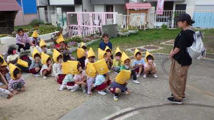 自分を守るために防災頭巾を被って、煙を吸わないようにハンカチで口と鼻を覆います。