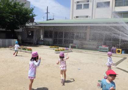 せっかく水着に着替えたので、ゆり組はシャワーをたっぷりあびて、ばら組は園庭でペットボトルシャワーで遊びました。