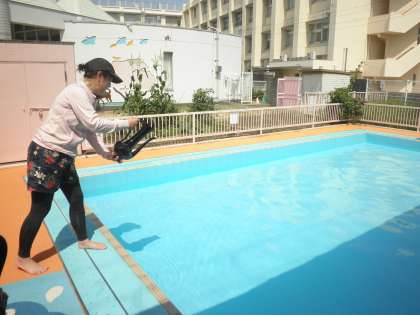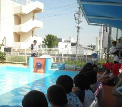園長先生が「みんなが毎日元気に楽しくプールに入れますように」と願いをこめて、プールに魔法の水をいれてくれました。