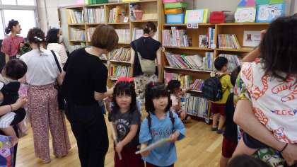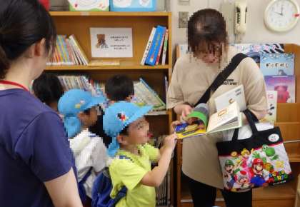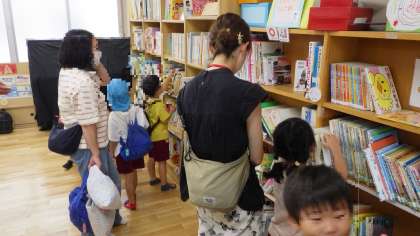 「どれにするー?」「ザリガニ?カブトムシ?」、「お母さん鳥がすきやからこれどう?」「ありがとう」保護者の方とお話しながら選んでいました。夏休みの間にもいろいろな絵本やお話に親しんでくださいね!
