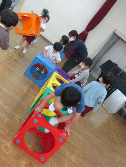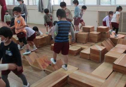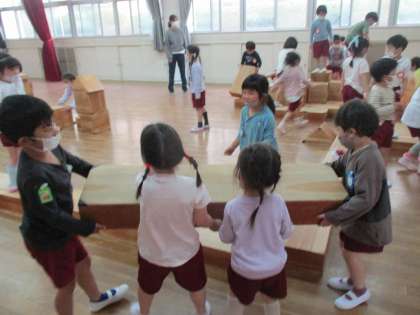 ゆり組・ばら組が協力して積み木を運び、迷路やおうちをつくり楽しみました。