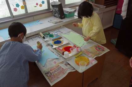 プリンカップや段ボールの側面に絵の具をつけ、こいのぼりの鱗に見立ててペタペタと押します。「みてみて!」「こんどはみどりにしよう」と、何度も繰り返しスタンピングを楽しみました。