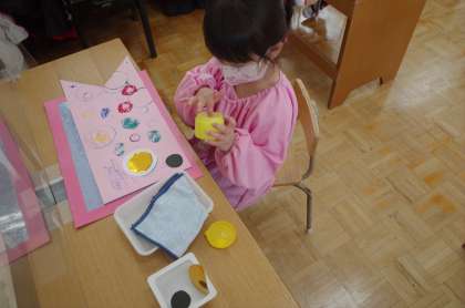そのあと、のりを指につけ薄くのばし、こいのぼりの目を貼り付けて完成!