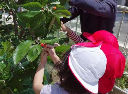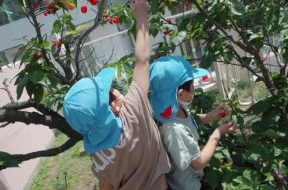 さくらんぼが少しずつ色付く様子に気付き、「さくらんぼ食べたいな〜」と収穫を楽しみにしていた子どもたち。