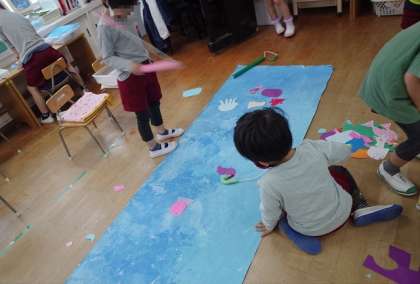 魚釣りごっこを楽しんでいるゆり組の子どもたちは、魚たちはどこにいるんだろうと考えて、昨日大きな模造紙にみんなで絵の具で大きな海をかきました。