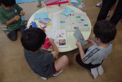 今日も朝から、魚や生き物をつくっています。自分がイメージする形にしようと、慎重にハサミで切る子どもや、同じ形を2枚つくるために、画用紙を重ねて切る子どももいます。
