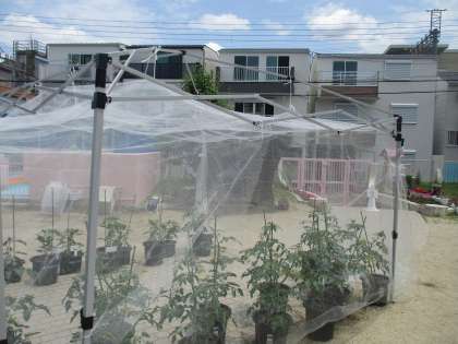 5月初めにはたくさんのカラスが幼稚園のそばの電線に集まり、ソラマメを取って行ってしまいました。そこで、今年はテントの骨組みにネットを張り、野菜たちをカラスから守ろうと考えました。