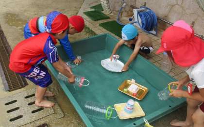 「トマトですよ」と同じ色のスーパーボールを集めたり、キラキラボールをすくったりして水遊びを楽しみました。スチレン皿やプリンカップでつくったお船を浮かべていたら、「雨ですよ〜♪」と、ペットボトルシャワーの雨を降らせる子どもたちが現れ…。最後はお庭がシャワーの雨だらけになりました。