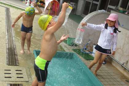 ゆり組さんは、顔や頭にお水を掛け、「気持ちいい〜」と満足気。冷たい水の心地良さを感じ、「早くプールに入りたい!」