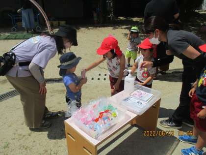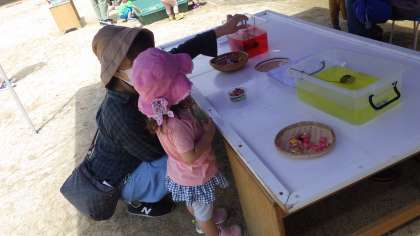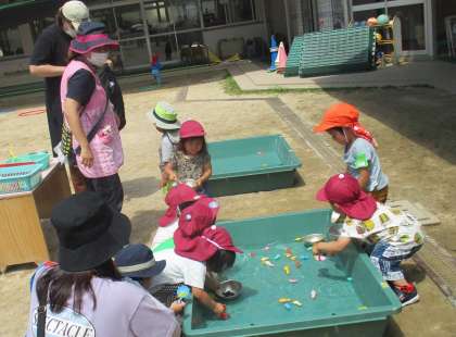 未就園の子どもたちは、魚つりをしたり、色水にお花を浮かべたりと、水の気持ちよさを感じながら遊んでいました。