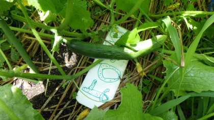 「ナスが大きくなってきた!はやく食べたいなあ」「葉っぱの下にキュウリが隠れてた!」「カボチャの赤ちゃん、可愛いね」