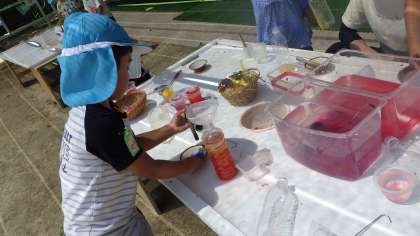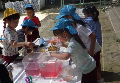 お花紙をすり鉢とすりこぎですりつぶしたり、水の中で混ぜたりして、色の美しさを感じながら、ジュースづくりを楽しんでいます。美味しそうなジュースができたら、お店屋さんごっこの始まりです!