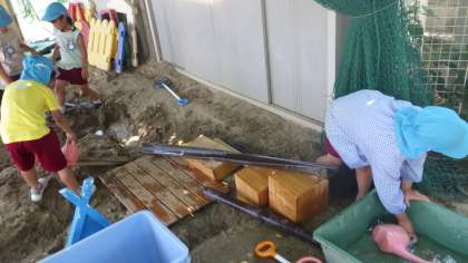 砂場では、積み木を使って傾斜をつくり、水を流したり、船を動かしたりすることを楽しんでいました。