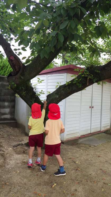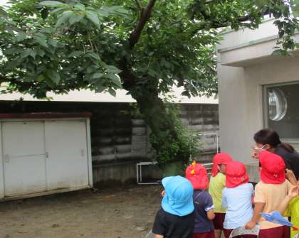 「セミが鳴いている!!」と気が付いたばら組の子どもたち。