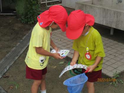 「どこにいるんだろう」「どのセミかな?」と図鑑片手に園庭を探していました。