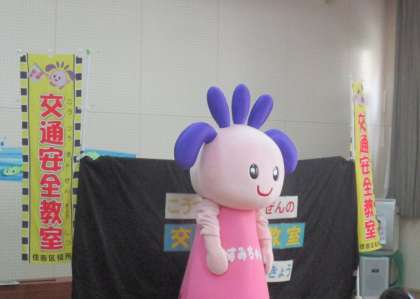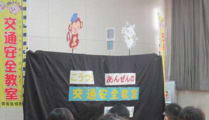 サルとネコのペープサートのやり取りを通して、楽しく信号や遮断機の安全について教えていただきました。最後に住吉区のキャラクターすみちゃんがやってきて、子どもたちは最高の笑顔に!