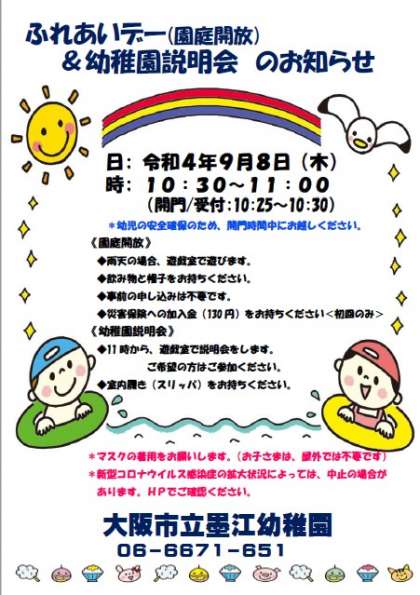 9月ふれあいデー・幼稚園説明会のお知らせ♪ 公開日 2022/07/22 更新日 2022/07/22 お知らせ 9月8日(木)10:30からふれあいデーと幼稚園説明会を行います。ただし、感染状況により、中止となる場合がありますので、随時ホームページをご覧ください。 いいね(0)