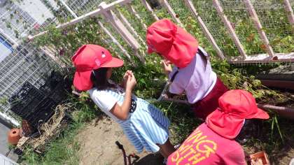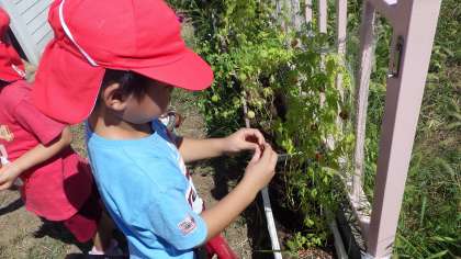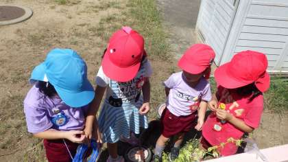 園庭では、トンボを捕まえたり、草花の種取りをしたりして、遊んでいます。
