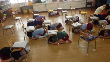 子どもたちは、先生の指示や園長先生のお話を落ち着いて聞いていました。訓練のあと、「東日本大震災」の話を聞き、神妙な面持ちでした。