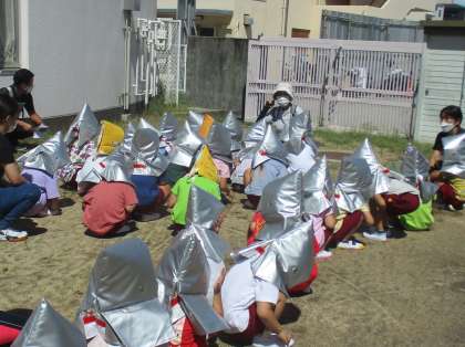 防災頭巾を被り園庭へ避難したあと、全員の無事を確認して、2次避難場所である墨江小学校へ行きました。