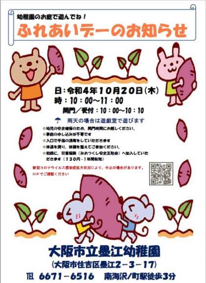 10月ふれあいデーのお知らせ♪ 公開日 2022/09/13 更新日 2022/09/13 お知らせ 10月20日(木)10時から、ふれあいデーを実施します。 感染症の拡大状況によっては中止することがありますので、随時ホームページをご覧ください。 いいね(0)