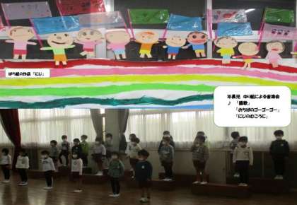 今日は作品展。年長児による音楽会も開催しました。保護者の方を前に、少し緊張の面持ちの子どもたちでしたが、たくさんの拍手をいただいて嬉しそうでした。