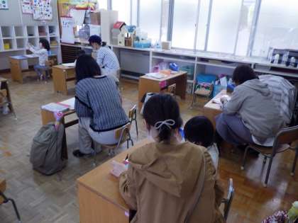 また、未就園児を招いての「ふれあいデー」がありました。園庭には、暖かい日差しの中、小さいお友達23人が遊びに来てくれました。保育室では、おうちの方と一緒に作品を見たり、シールを貼って自分だけのカレンダー作りをしたりして過ごしました。