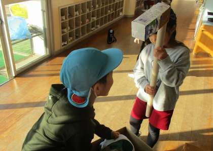牛乳パックを杵にみたて、餅つきごっこを楽しんでいた子どもたち。牛乳パックでできた杵は、本物のように重く、「うわぁ、ちょっと重いわ」と扱いに苦戦しながらも、おもちつきの日を心待ちにしていました。