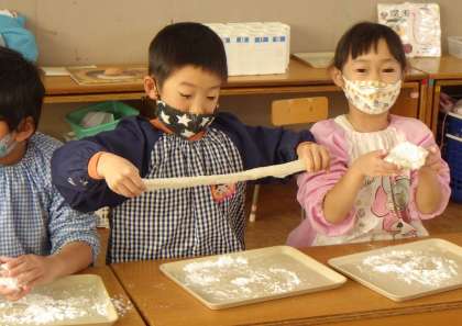 つきあがったお餅を手に「あったかーい」「きもちいい〜」「みて!のびた」と、口々に思いを表現していました。
