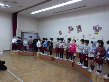 次に、ゆり組(5歳児)が、台の上に立って、歌と合奏をしました。ゆり組の歌と合奏を聴いたばら組は、