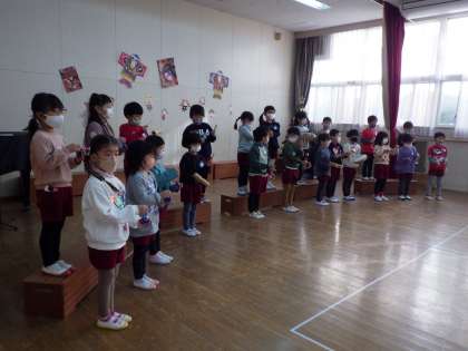 発表会ごっこでは、はじめに、ばら組(4歳児)が、以前ゆり組に聴かせてもらった歌と楽器遊びをしました。ばら組の歌と楽器遊びを聴いたゆり組は、