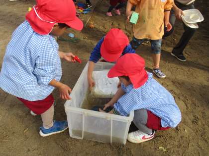 アトリエ着を着て腕まくりをした子どもたちが砂場の遊具を洗いました。最初は温かかったタライに入れたお湯も次第に冷えてきましたが、子どもたちは最後まできれいに洗って満足顔でした。