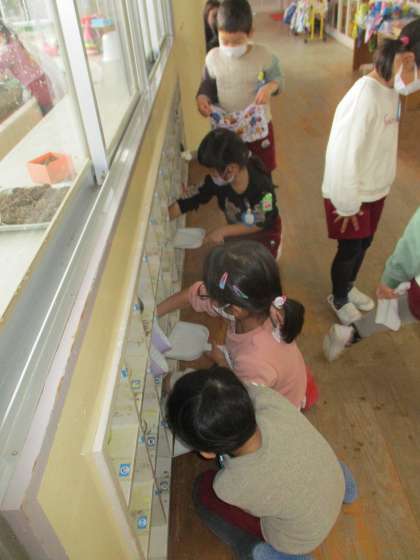 保育室では、自分たちが使っているロッカーやかごを雑巾で拭いたり、靴箱の砂を掃き出したりしてきれいにし、新年を迎える準備は完了です。