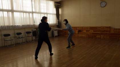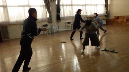 不審者が園内に入ってきたことを想定し、さすまたの持ち方や扱い方、不審者への対応などを教えていただき、実践しました。