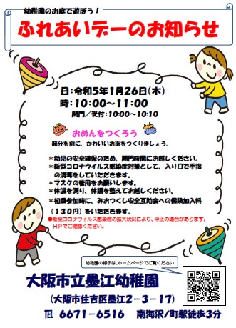 1月ふれあいデーのお知らせ 公開日 2023/01/06 更新日 2023/01/06 お知らせ あけましておめでとうございます 1月26日(木)10:00〜11:00 1月のふれあいデーをします。 感染症拡大の状況によっては中止する場合もありますので、ホームページにて事前にご確認ください。 いいね(0)