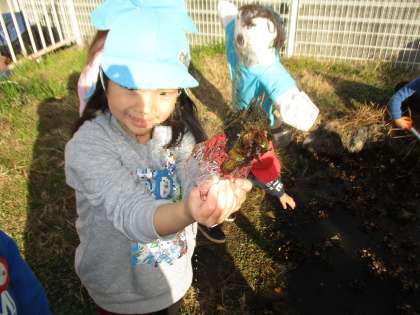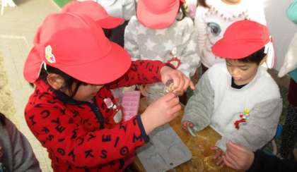 一昨日、氷はできていませんでしたが、昨日と今日は…「氷できてる!」と朝の用意を済ませると、お外へ元気に飛び出した子どもたちでした。つららができていて、なかよし池には氷が張っていました。「(入れ物の)下も凍ってる!」「おっきーい!」と見合ったり、太陽にきらきらかざしてみたりもしていました。とっても寒い一日でしたが、貴重な経験ができました!