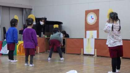 ゆり組さんの劇遊びを見て、「あんなふうにやってみたい!」と憧れの気持ちをふくらませたり、「今度はおおかみさんやりたい!」と違う役をしたい気持ちになったりしています。これからもお友達と一緒に表現することを楽しんでいきたいと思います。