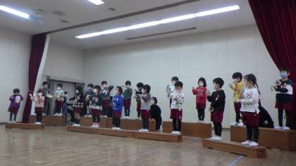 初めての生活発表会。少し緊張している子ども、「おうちの人にいっぱい見てもらいたい!」と楽しみにしている子どもなど、様々な気持ちの子どもたちでした。生活発表会に向かう遊びの中で、歌・楽器遊びでは友達の声や息づかいを感じ、次第に歌声や楽器の音が重なるようになりました。劇遊びでは、自分なりの言葉や動きで一生懸命に表現している姿がありました。