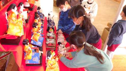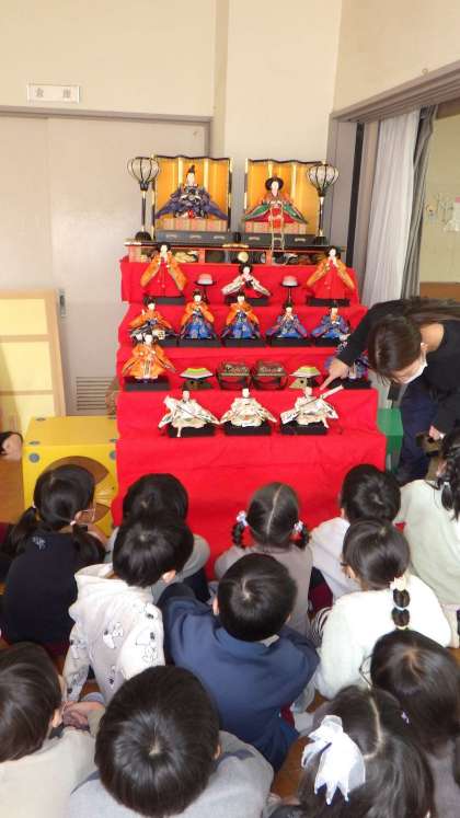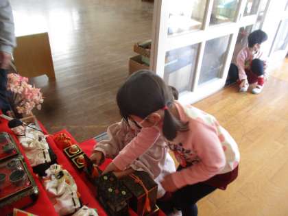 子どもたちに、ひなまつりの話や、それぞれの人形や道具の意味を知らせながら、ひな人形を飾りました。ゆり組は、台に乗り、高いところに、ばら組は道具をそっと持って、飾りつけをしてくれました。
