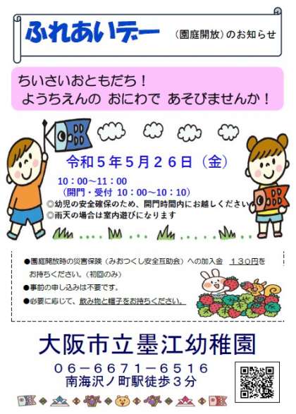 5月のふれあいデー 公開日 2023/05/12 更新日 2023/05/12 お知らせ 5月26日(金) 10:00〜11:00 ふれあいデーがあります。 小さいおともだちが来てくれるのを、園児も待っています。 いいね(0)
